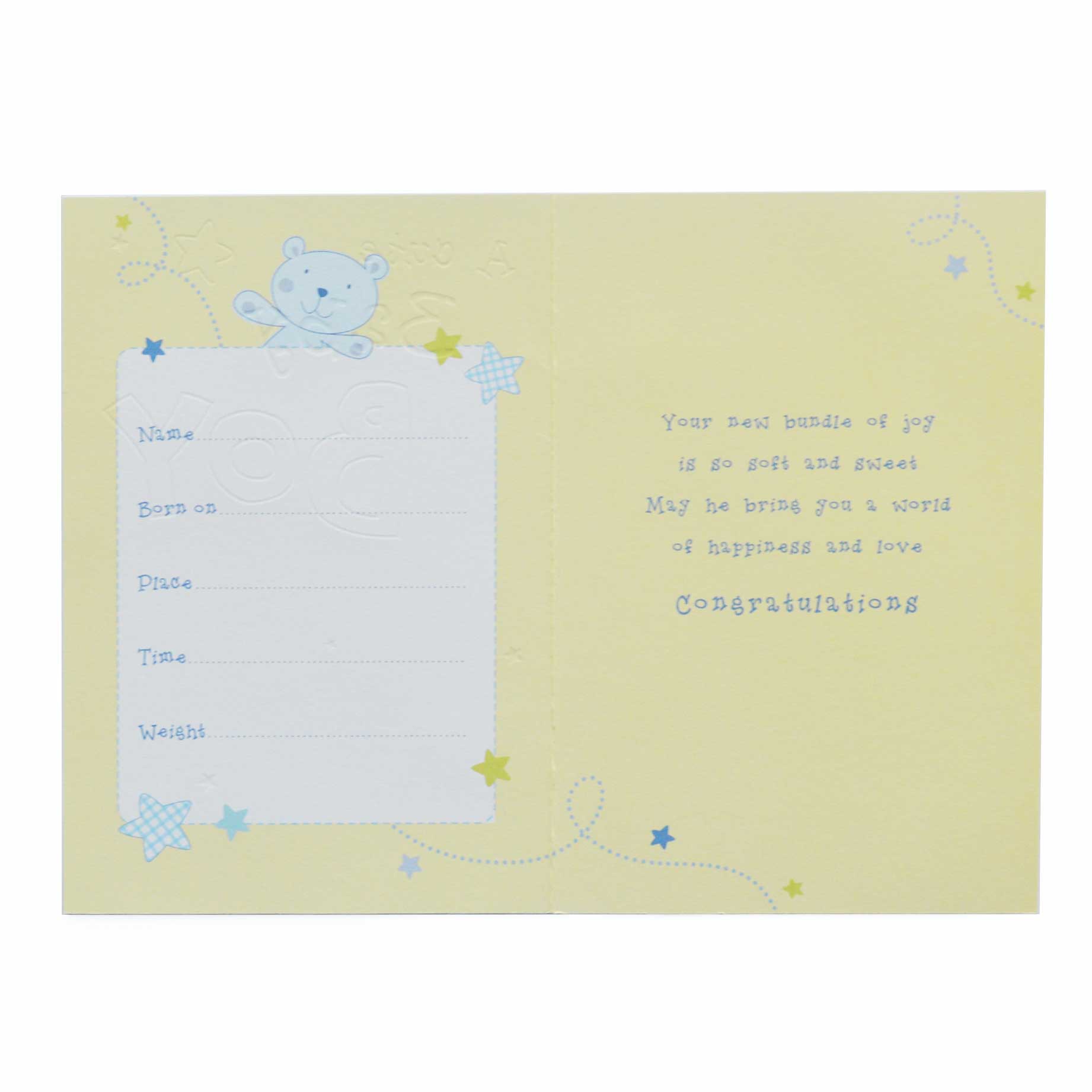 The message on the insert reads: “Name….Born on…..Place…….Time……Weight…….Your new bundle of joy is so soft and sweet may he bring you a world of happiness and love Congratulations ”