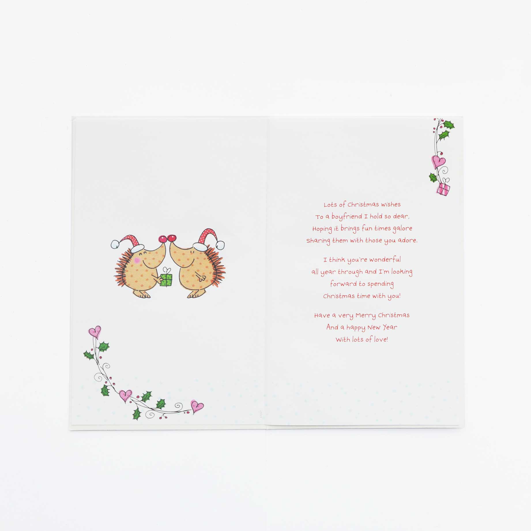 The message on the inside reads: “Lots of Christmas wishes to a boyfriend I hold so dear, Hoping it brings fun times galore sharing them with those you adore. I think you’re wonderful all year through and I’m looking forward to spending Christmas time with you! Have a very merry Christmas and a happy New Year with lots of love.”