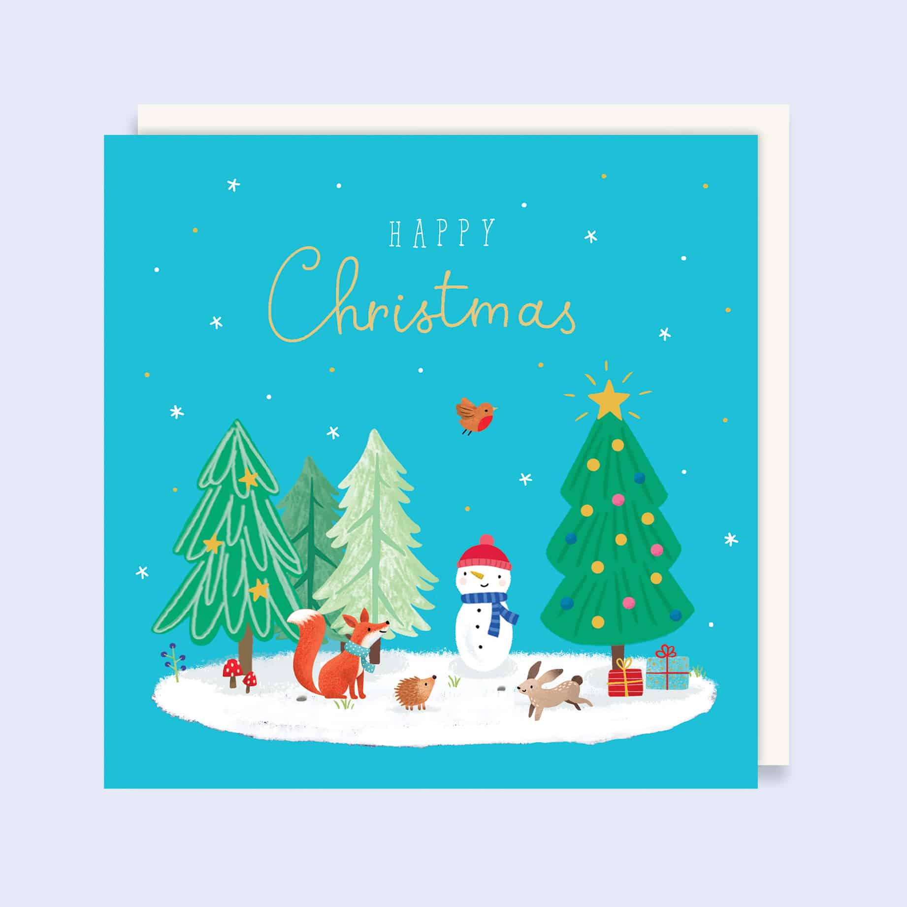 Card B: Front Message – “Happy Christmas” Design depicts a festive woodland forest scene, with animals gathered around a snowman