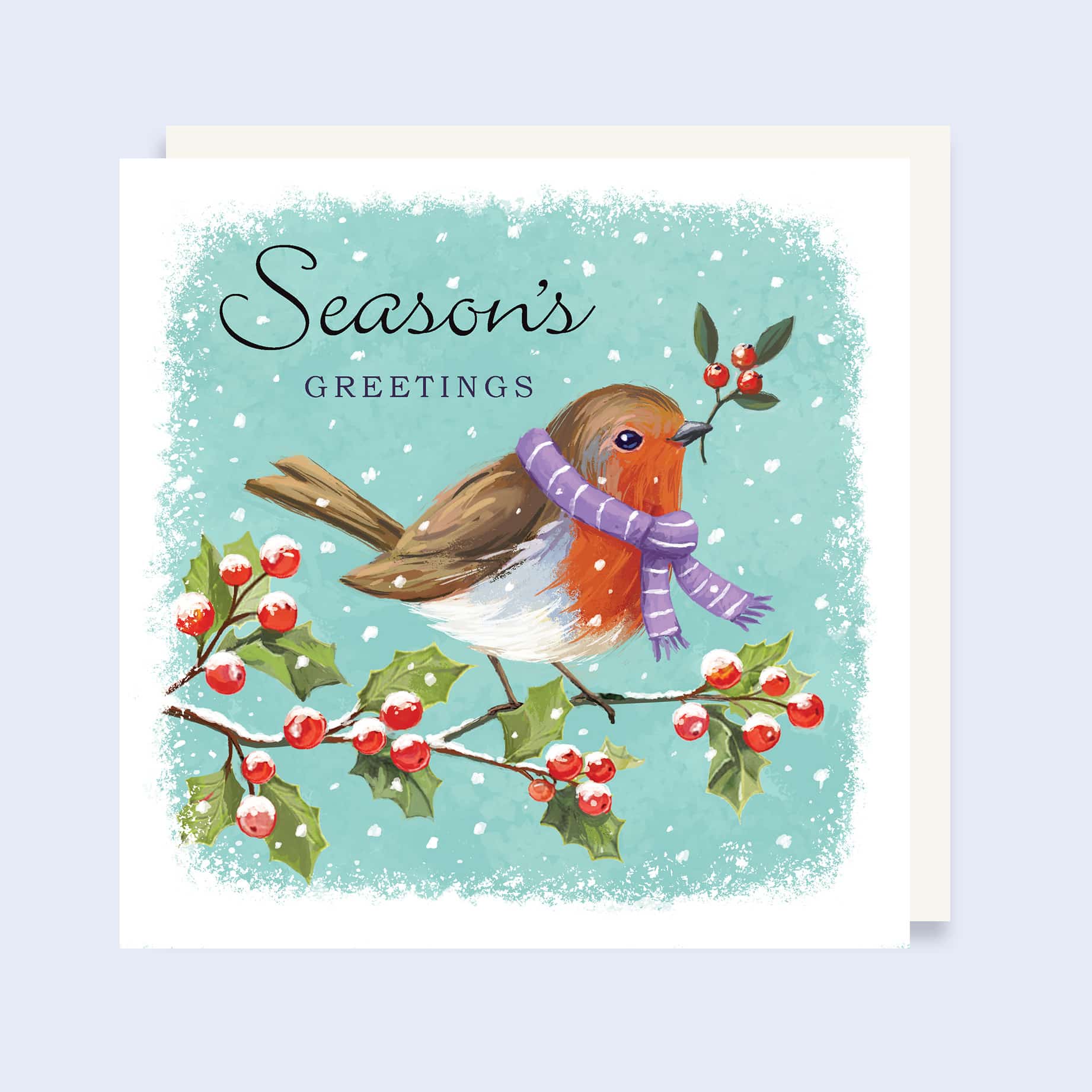Design features a robin wearing a cozy purple scarf, perched on a branch adorned with holly berries against a snowy, teal background.