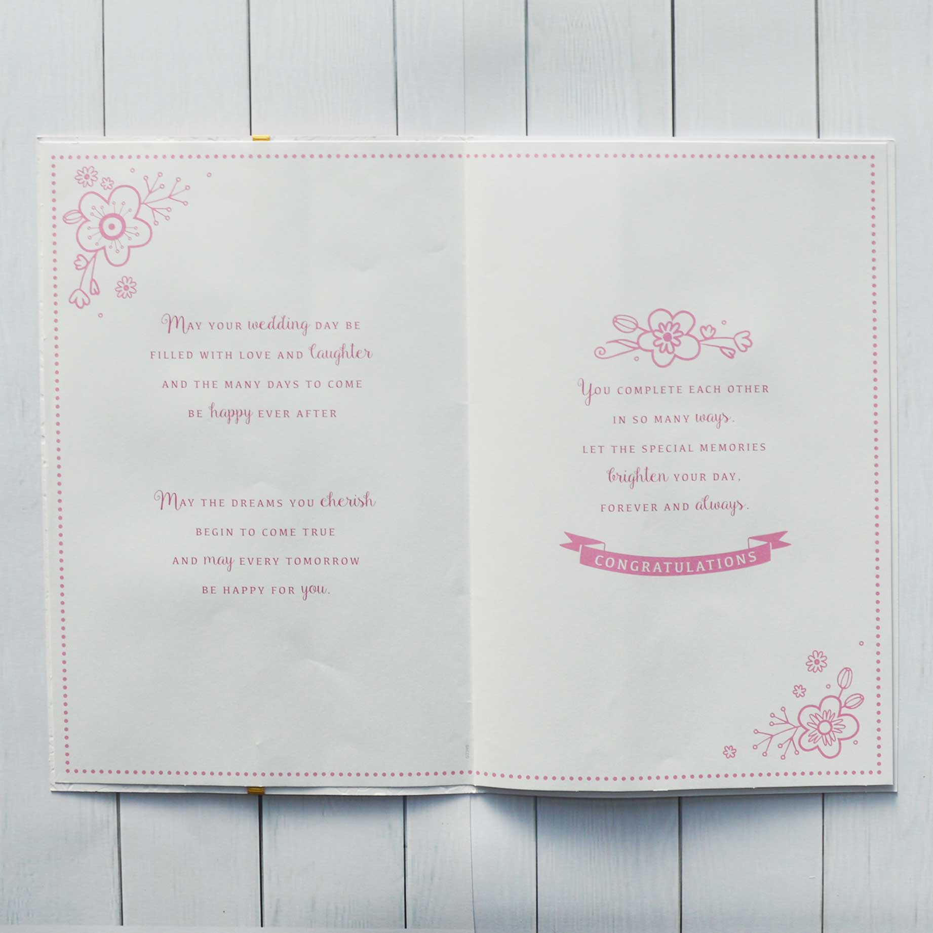 The message on the insert reads: “May your wedding day be filled with love and laughter and the many days to come be happy every after, may the dreams you cherish begin to come true and may every tomorrow be happy for you. You complete each other in so many ways. Let the special memories brighten your day, forever and always. Congratulations”