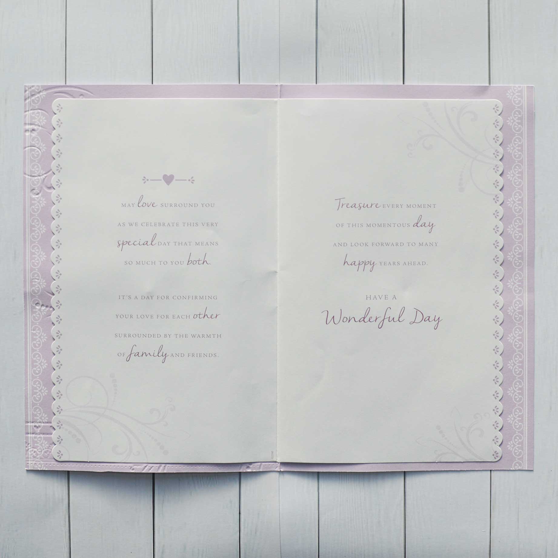 The message on the insert reads: “May love surround you as we celebrate this very special day that means so much to you both. It’s a day for confirming your love for each other surrounded by the warmth of family and friends. Treasure every moment of this momentous day and look forward to many happy years ahead. Have a wonderful day”