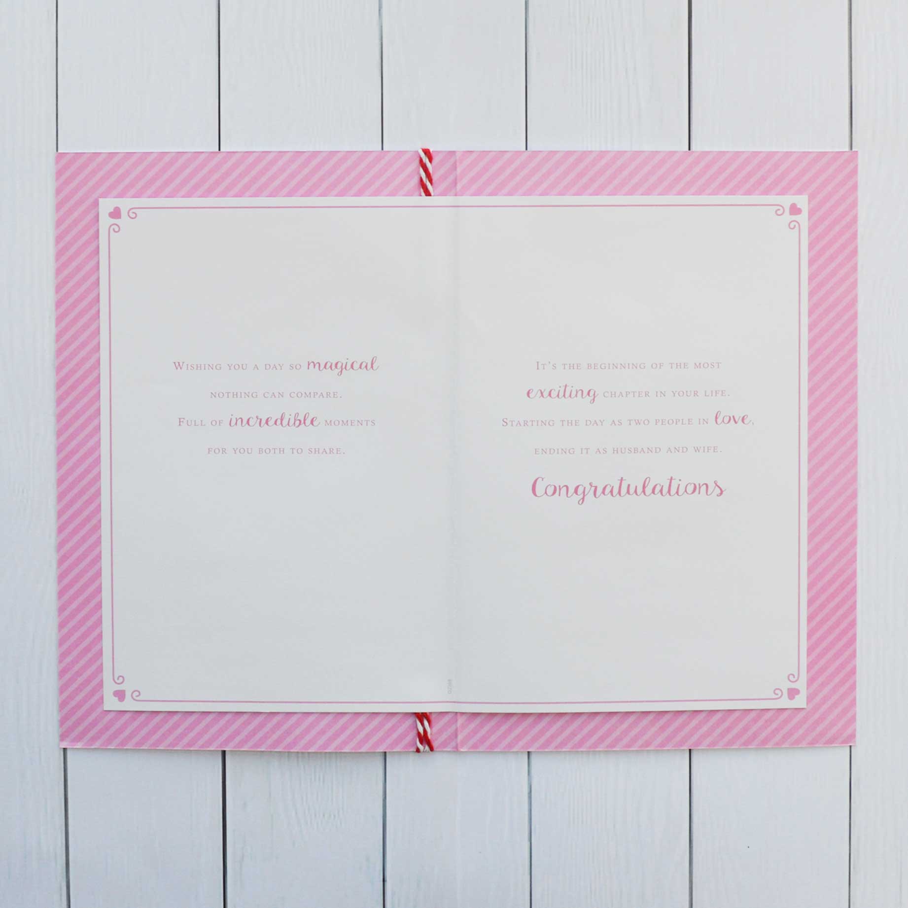 The message on the insert reads: “Wishing you a day so magical nothing can compare. Full-on incredible moments for you both to share. It’s the beginning of the most exciting chapter in your life. Starting the day as two people in love, Ending it as a Husband and Wife. Congratulations”